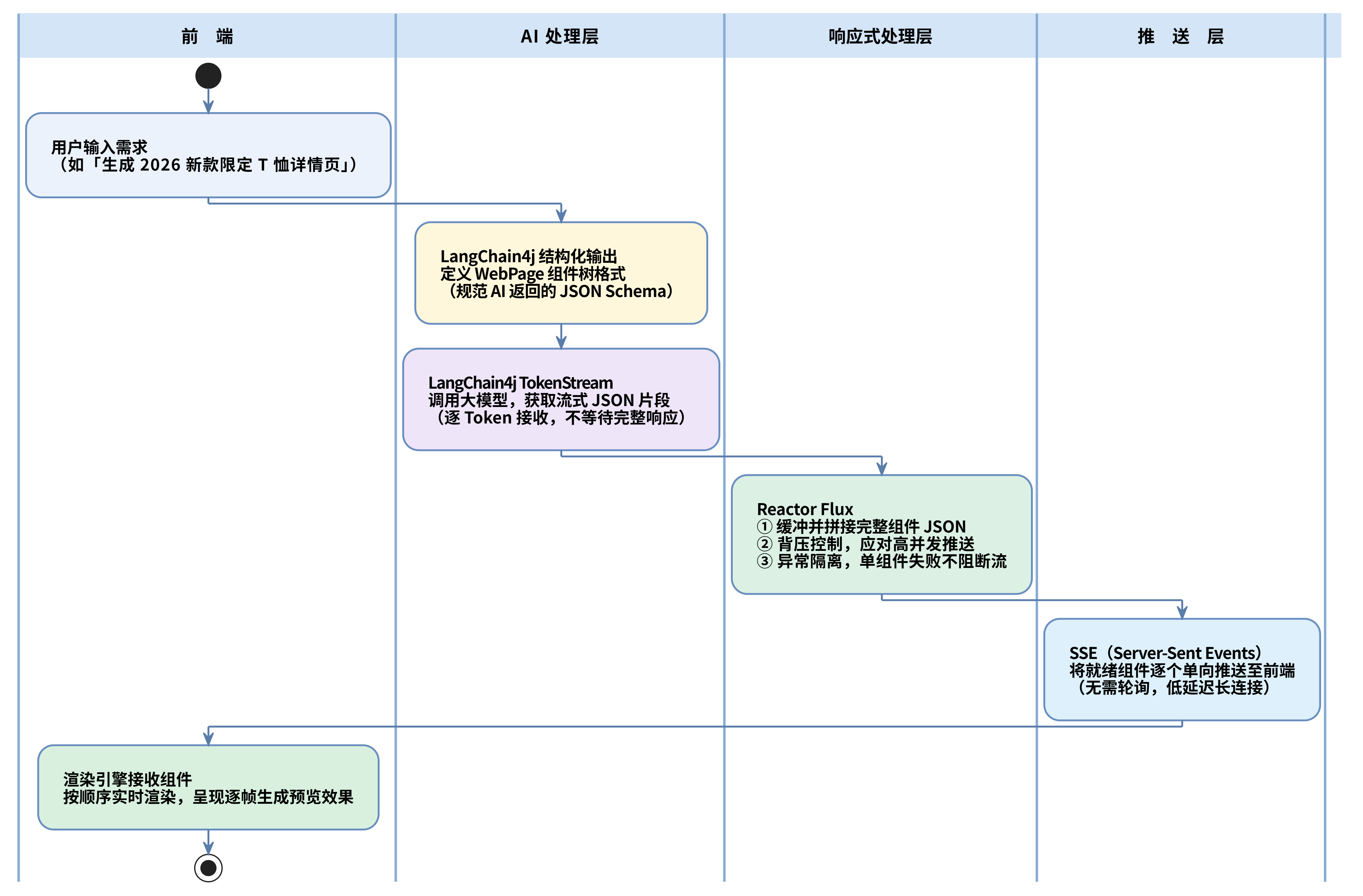 用了TokenStream + SSE,AI生成完一个完整的组件JSON片段,前端就立刻渲染这个组件,用户能实时看到进度。