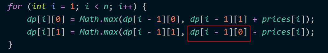 dp[i][1] = Math.max(dp[i - 1][1], dp[i - 1][0] - prices[i]);