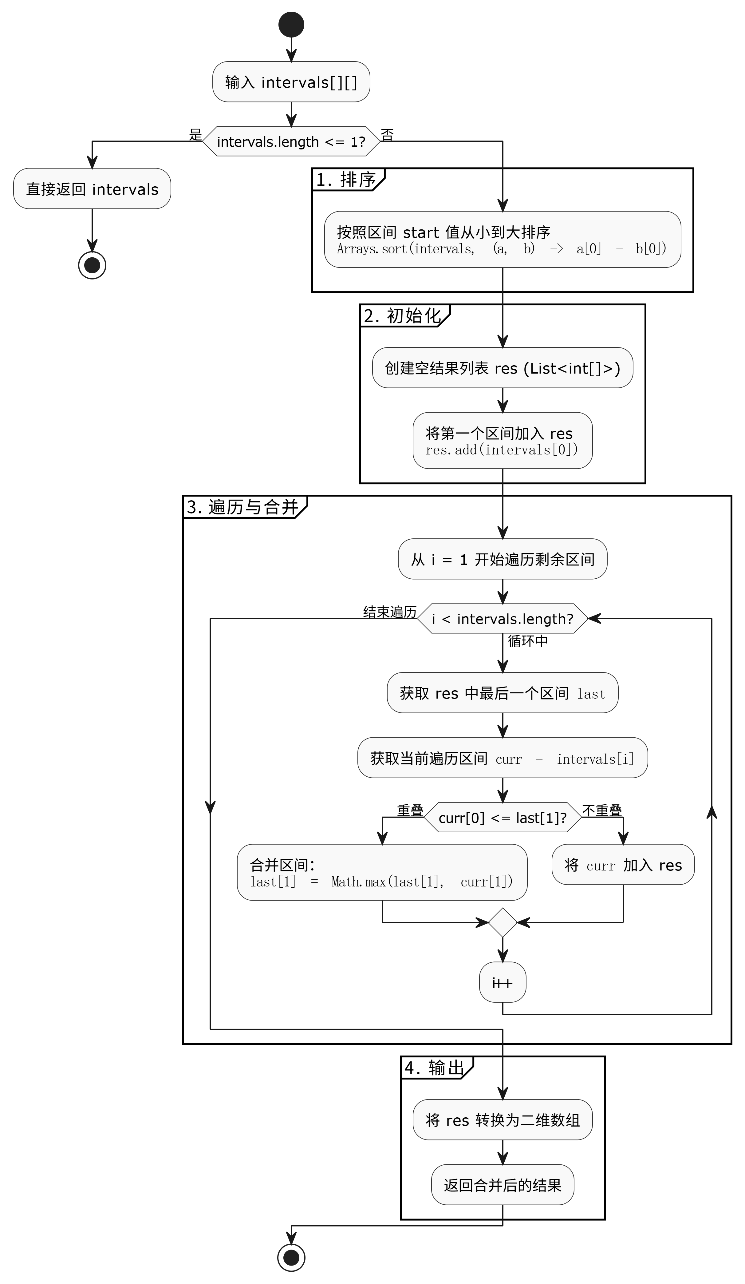 如果当前区间的起始值小于等于最后一个区间的结束值,说明两个区间重叠,就把最后一个区间的结束值更新为两者的最大值,完成合并;