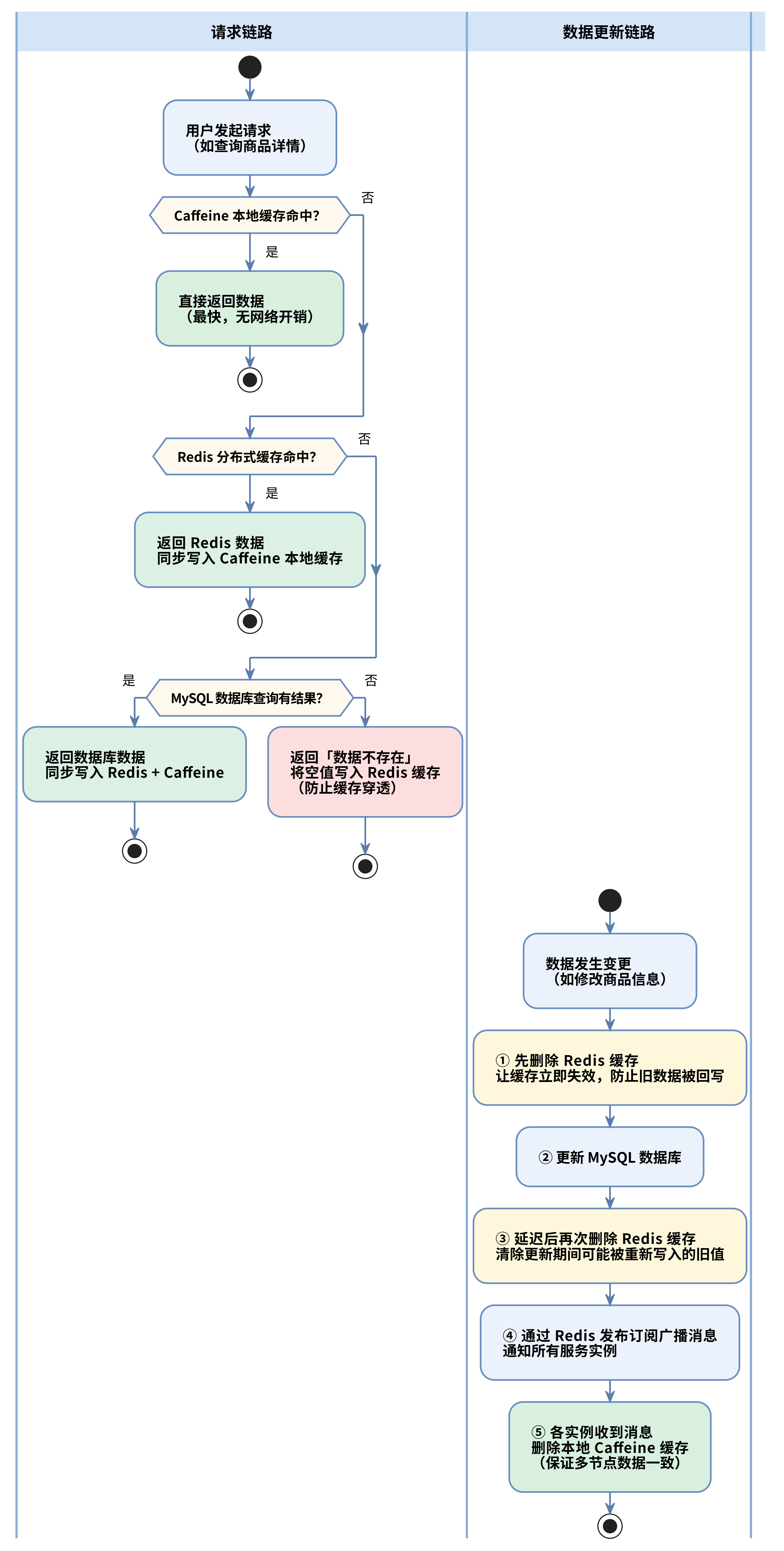③下次用户访问任何实例,都会去 Redis 里查询新数据,再更新到本地 Caffeine,保证全集群所有实例的数据一致。