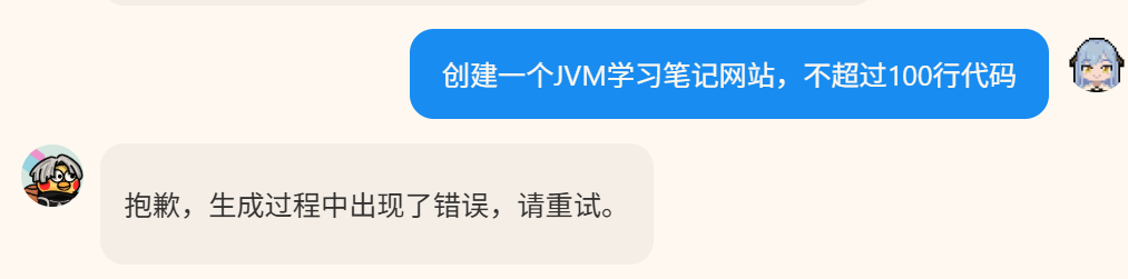 接口调用直接返回业务异常,前端无任何流式输出,日志无有效业务堆栈,仅提示:抱歉,生成过程中出现了错误,请重试。