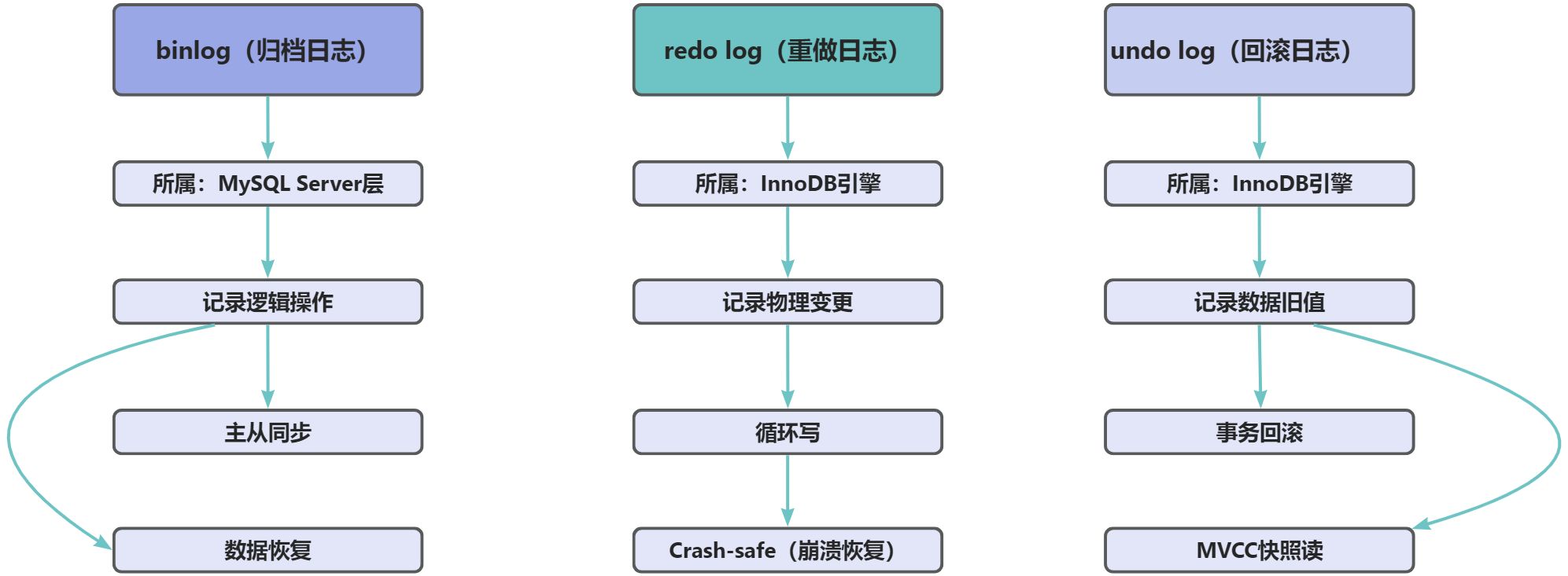 MySQL有binlog、redo log和undo log三种日志,其中binlog 负责主从复制和数据恢复,redo log保证崩溃后数据不丢失,undo log支撑事务回滚和MVCC。