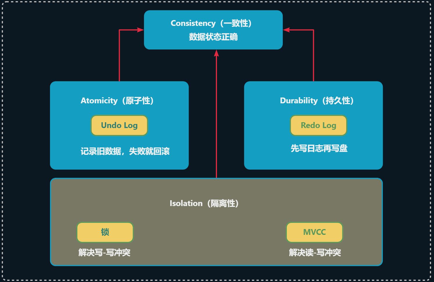 这四个组件分别对应事务的ACID特性的不同方面,一致性是由原子性、隔离性、持久性共同作用实现的。